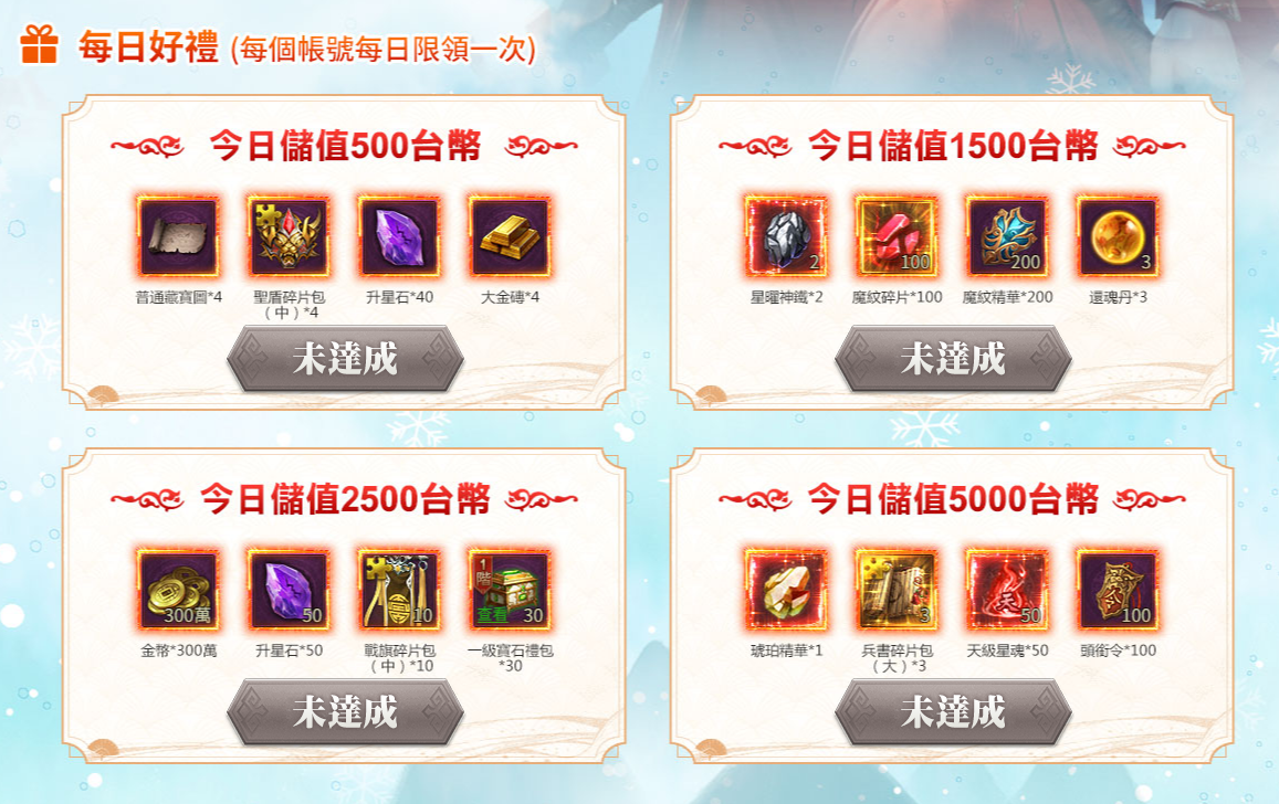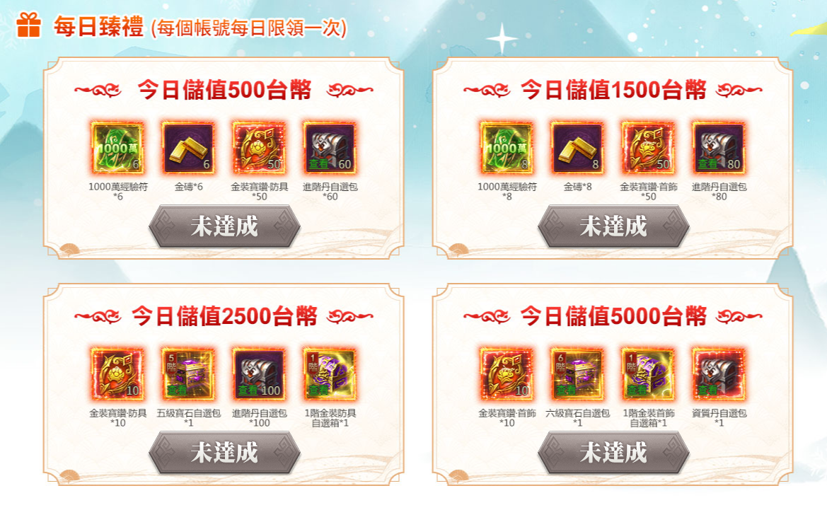 2、“每日好禮”“每日臻禮”達到活動條件每日僅可领取活動獎勵一次,儲值達到更高檔次,可以領取低檔次的獎勵,如:單日儲值5000台幣,可領取500、1500、2500、5000台幣檔次的禮包,以此類推。